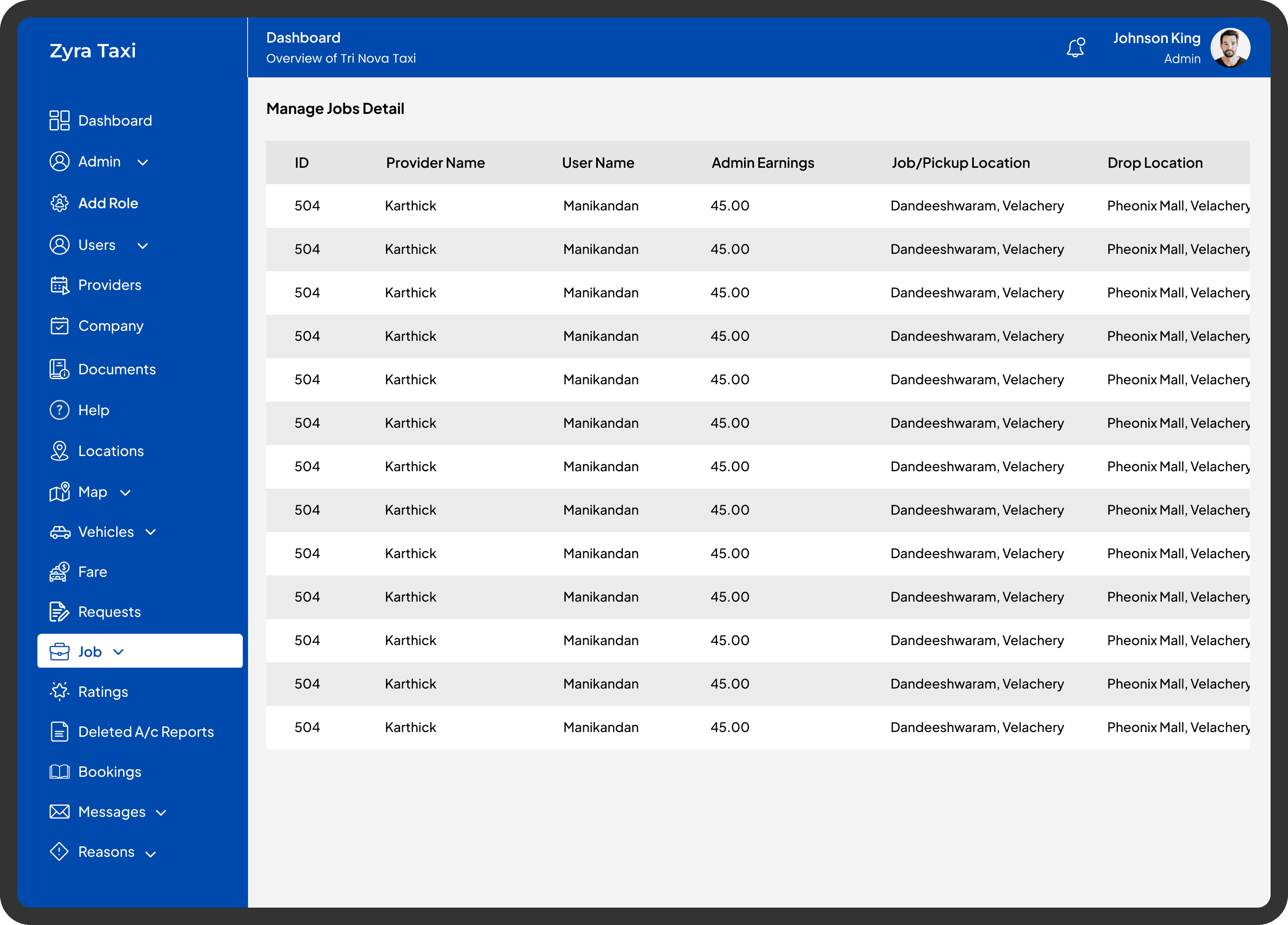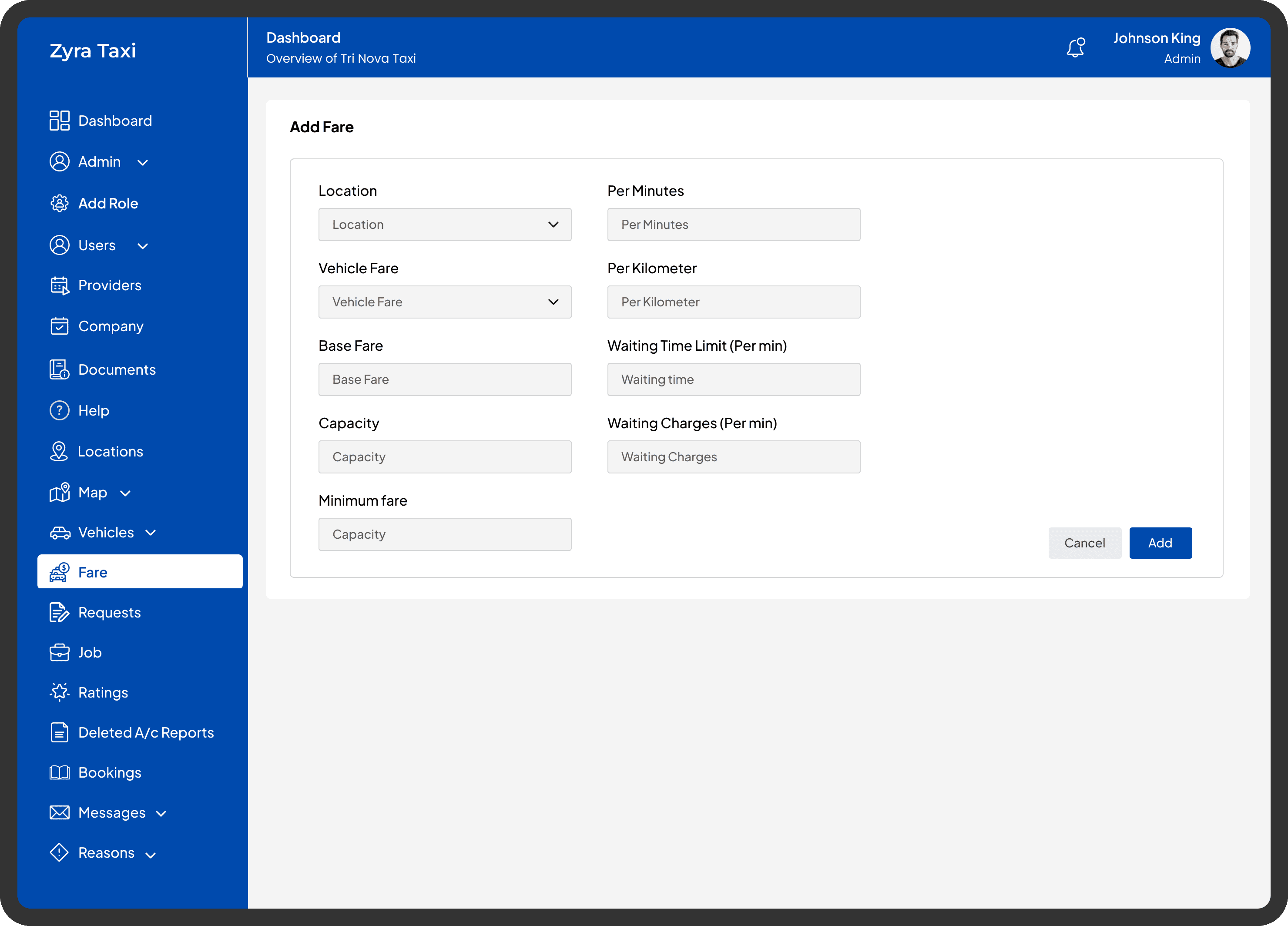 Add vehicle types (sedans, SUVs) and set fares easily.