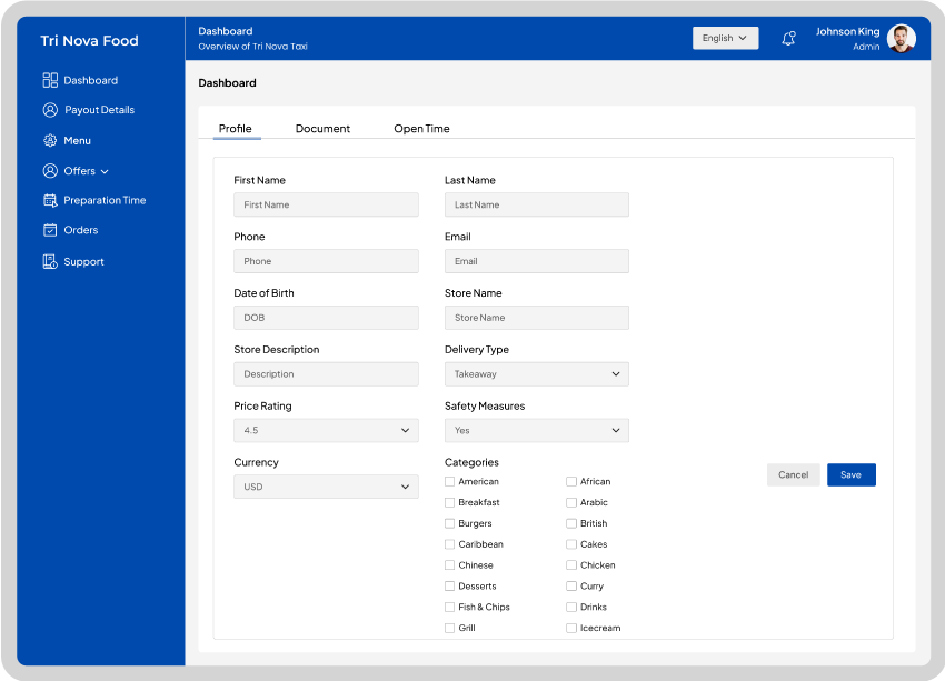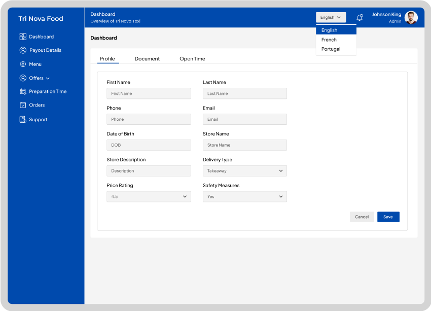 Both customers and delivery personnel can modify their profiles across web and mobile interfaces. Restaurant operators also have dedicated profile management.