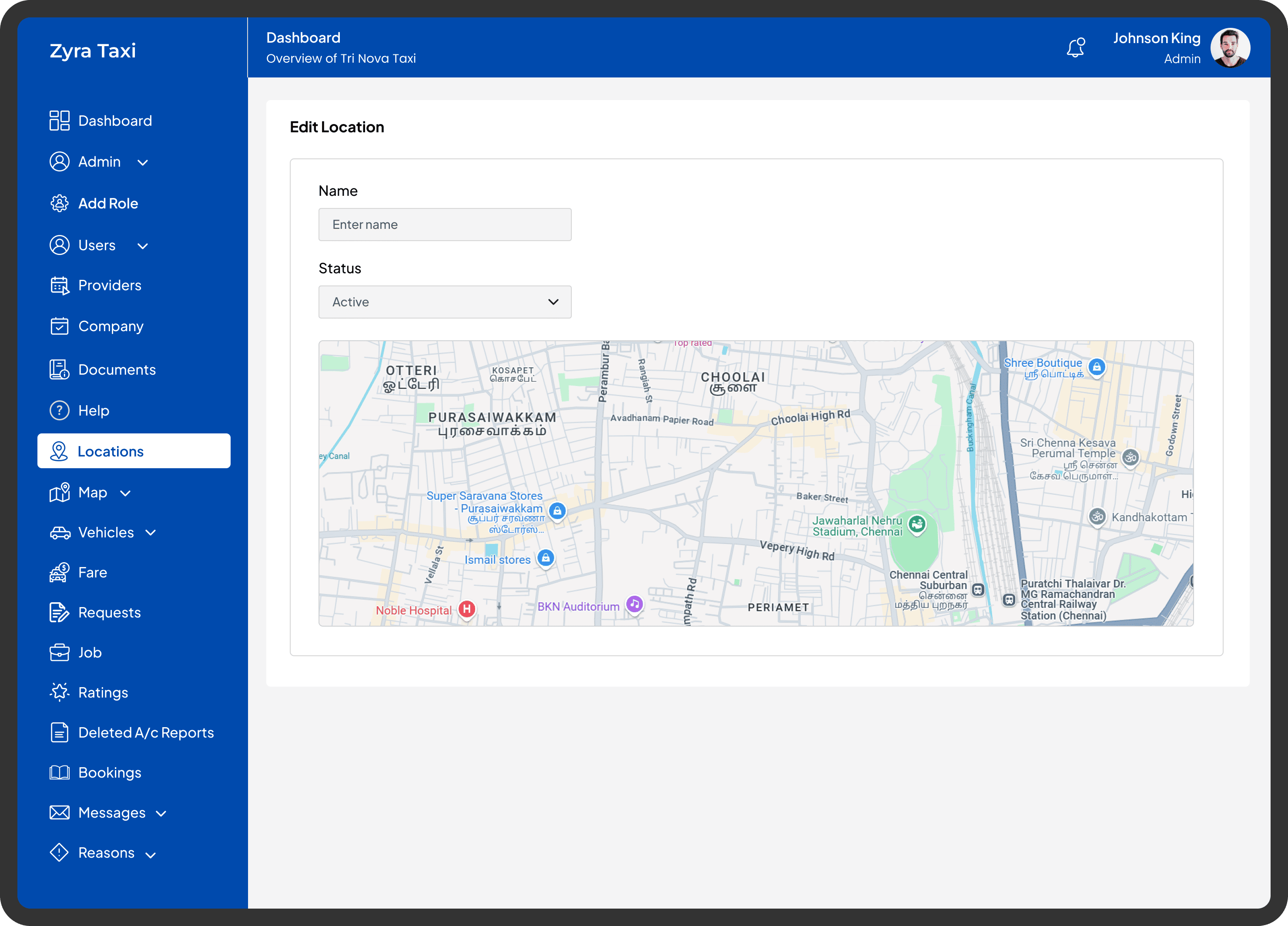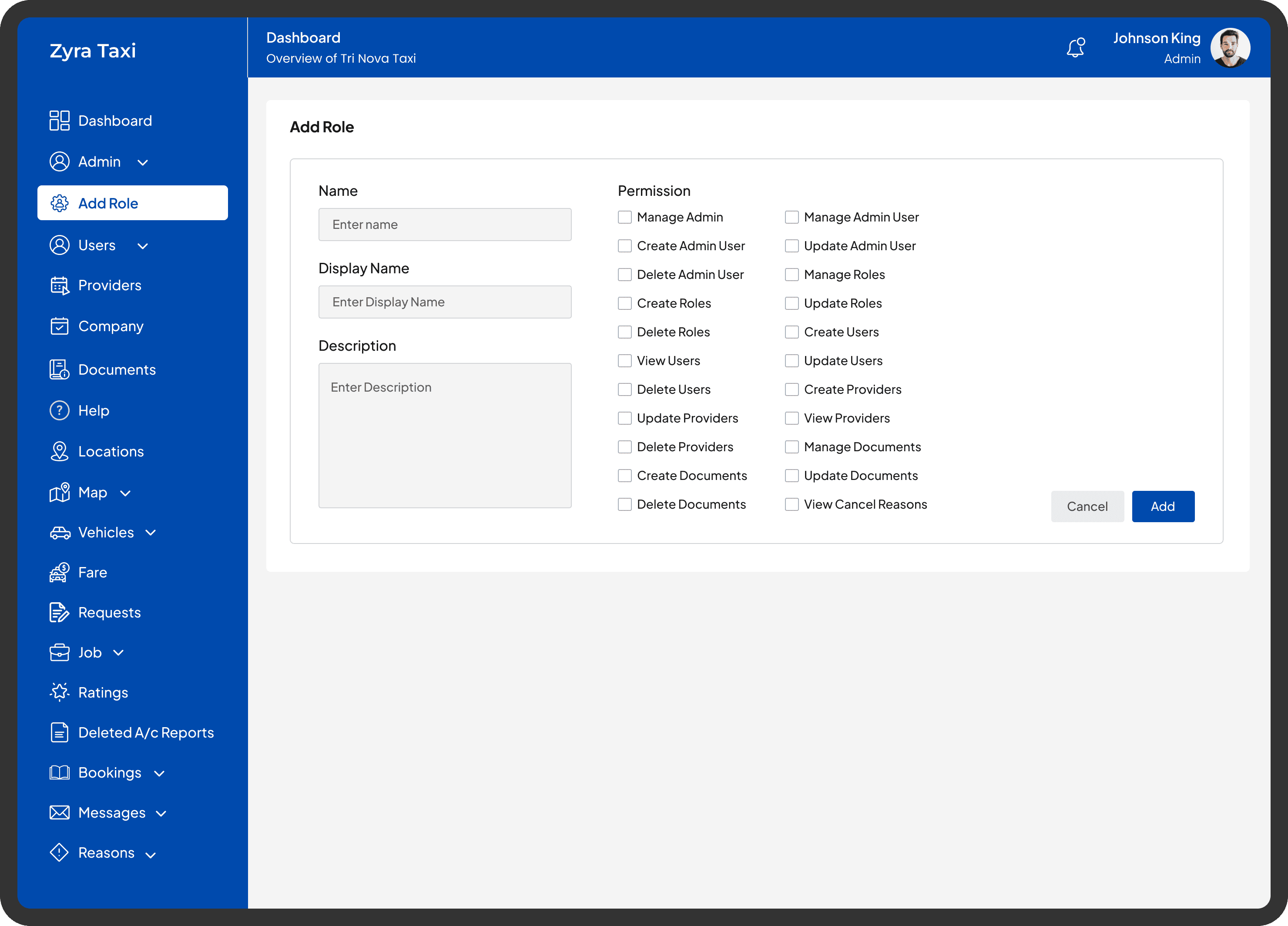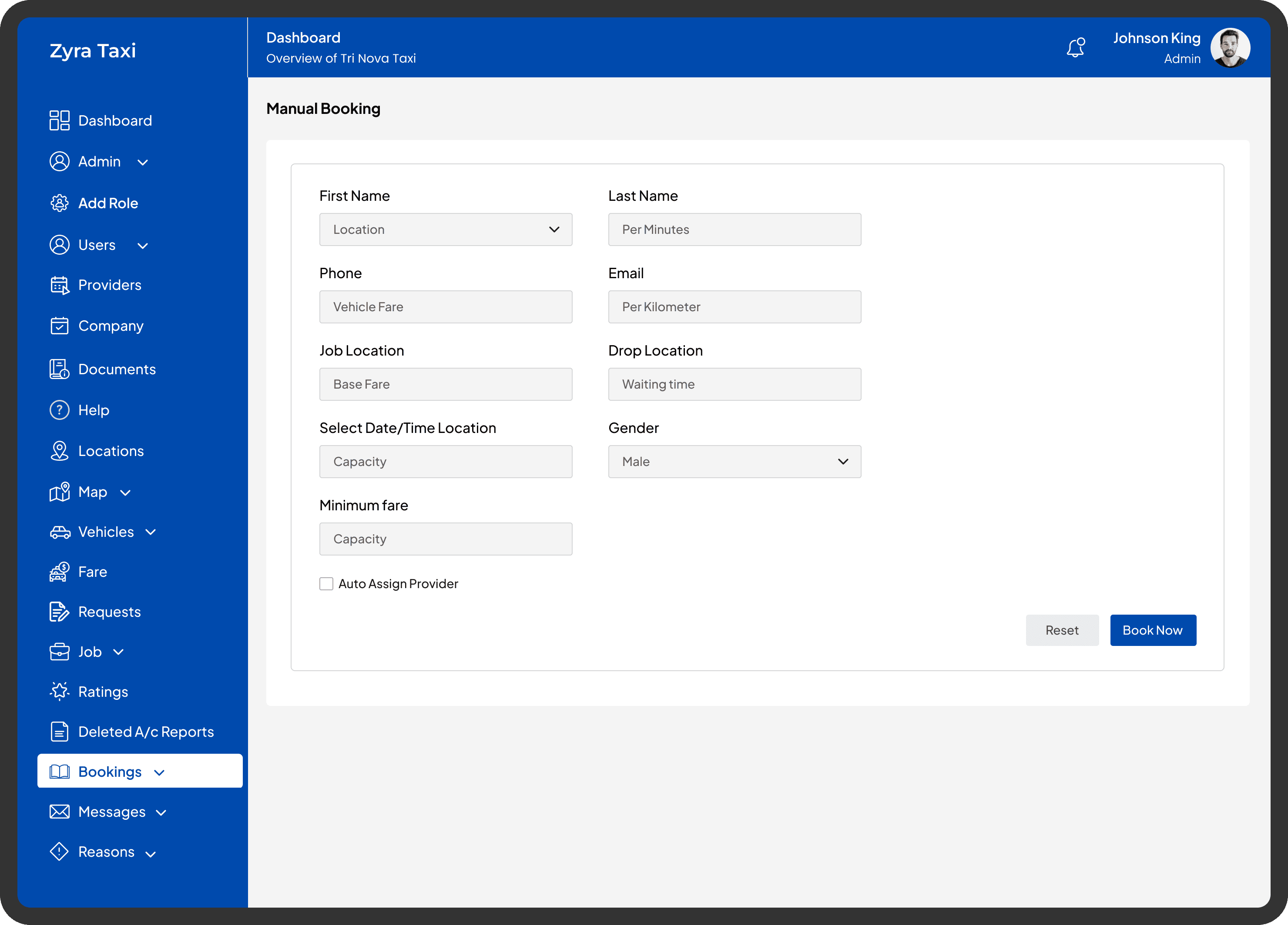Add vehicle types (sedans, SUVs) and set fares easily.